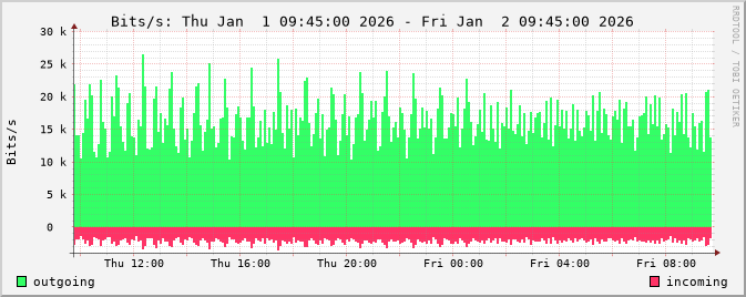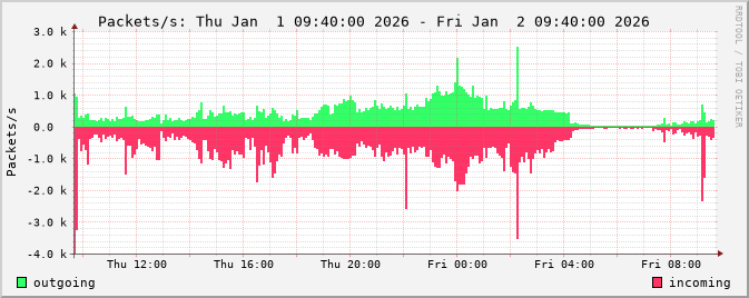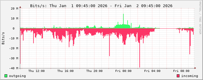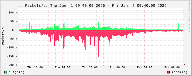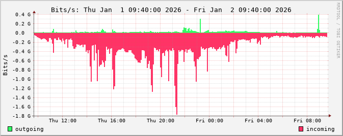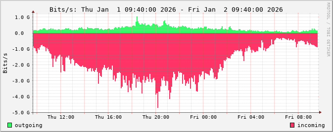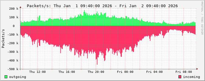 The netflow graphs are calculated from router netflow data. Three different types of statistics are displayed: traffic by bits/s, packets/s and flows/s.